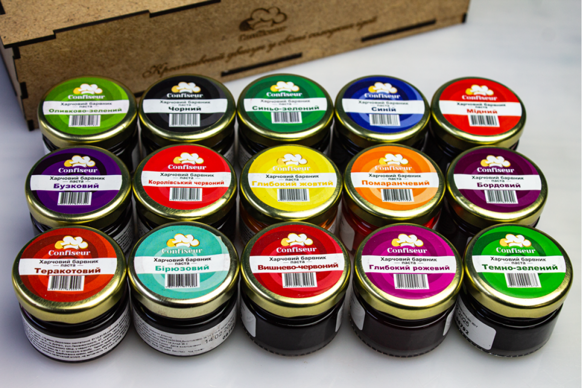 Confiseur пропонує палітру різноманітних барвників для додання блюдам привабливого зовнішнього вигляду. Враховуючи індивідуальні переваги по декору, можна купити пастоподібні харчові барвники і втілювати кулінарні фантазії в життя. Ознайомившись з продуктами нашого каталогу даної лінійки товарів, підберіть кілька баночок різного кольору, при змішуванні яких отримаєте незабутній айсинг, крем і тісто.