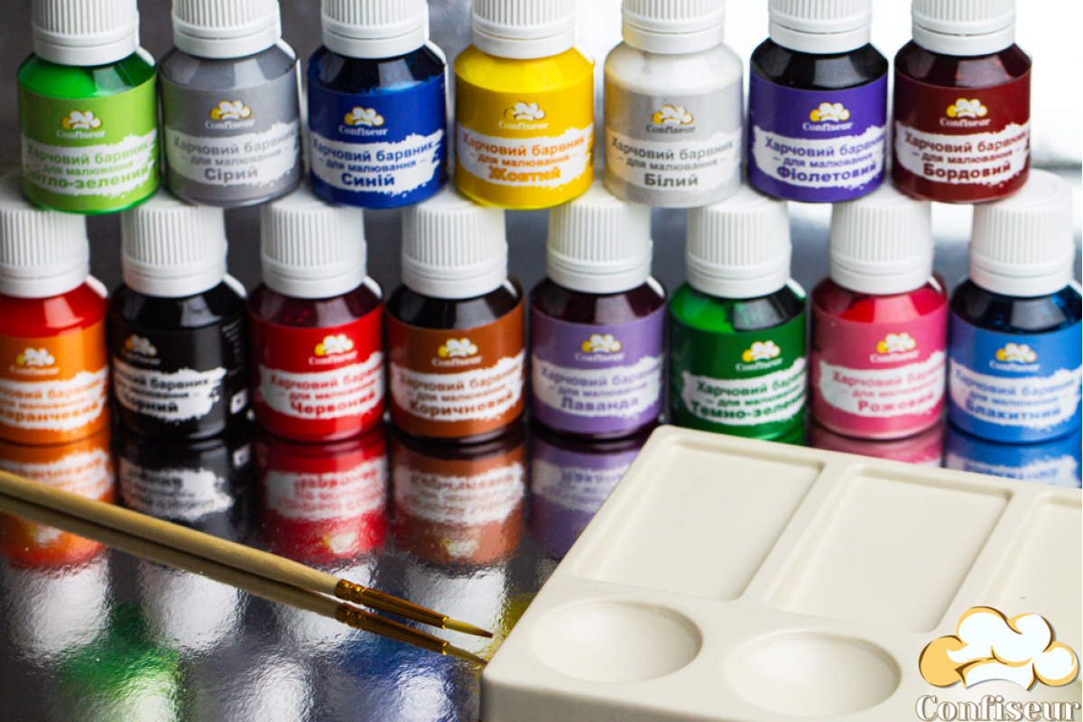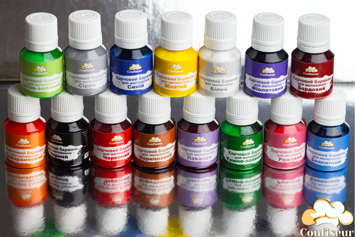 Красители пищевые для рисования, используются для нанесения изображений на пряниках, тортах, и других кондитерских изделий. Уникальность красителей для рисования, состоит в легкости нанесения, быстром высыхании на поверхности, а также четкой и яркой цветопередаче. Наши краски для торта не текут, ложатся равномерно и гладко. Красители абсолютно безопасны, сертифицированы и состоят только из пищевых составляющих.