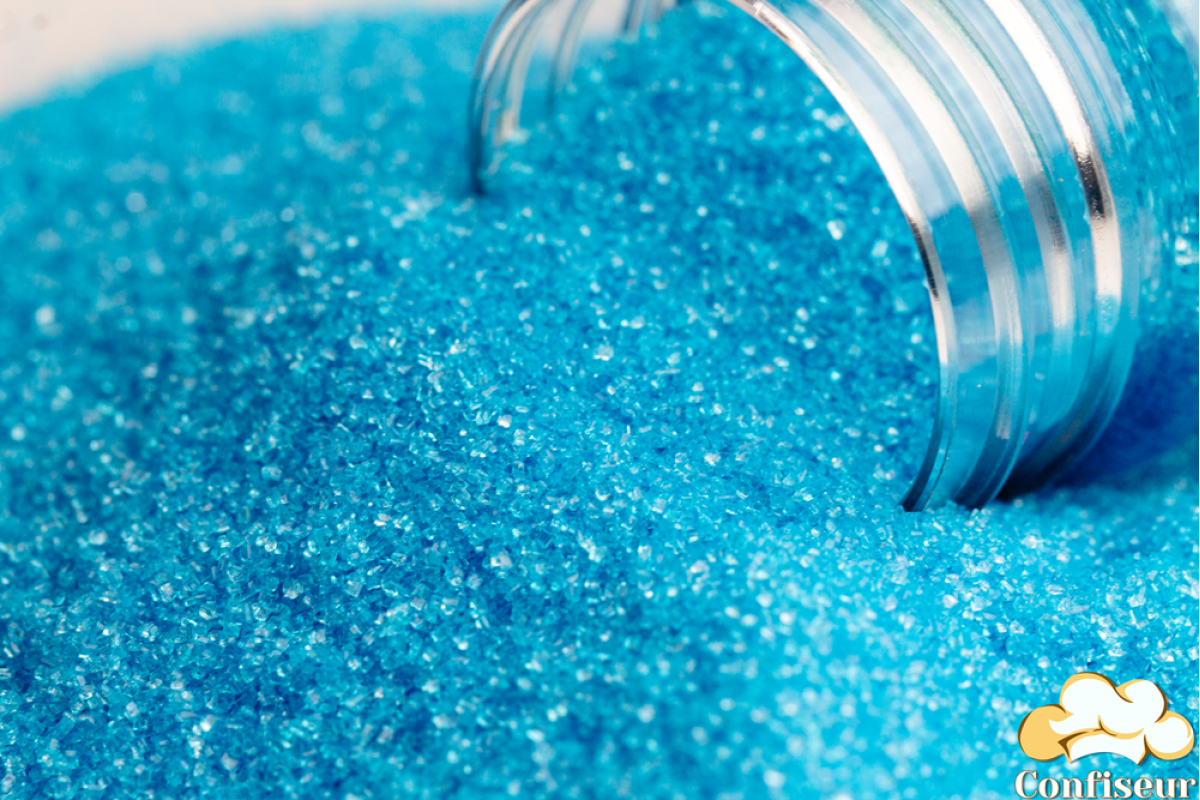 Cахар кольоровий, пофарбований блакитним харчовим барвником і покритий спеціальним харчовим блиском, завдяки чому він має гарний блиск, не розтікається на виробі, підходить для декору будь-яких кондитерських виробів та коктейлів. Цукор чітко відкалібрований і має однаковий розмір піщинок
