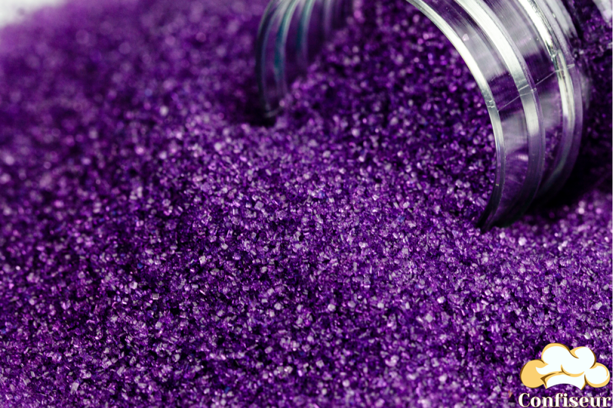 цукор кольоровий, пофарбований лавандовим харчовим барвником і покритий спеціальним харчовим блиском, завдяки чому він має гарний блиск, не розтікається на виробі, підходить для декору будь-яких кондитерських виробів та коктейлів. Цукор чітко відкалібрований і має однаковий розмір піщинок