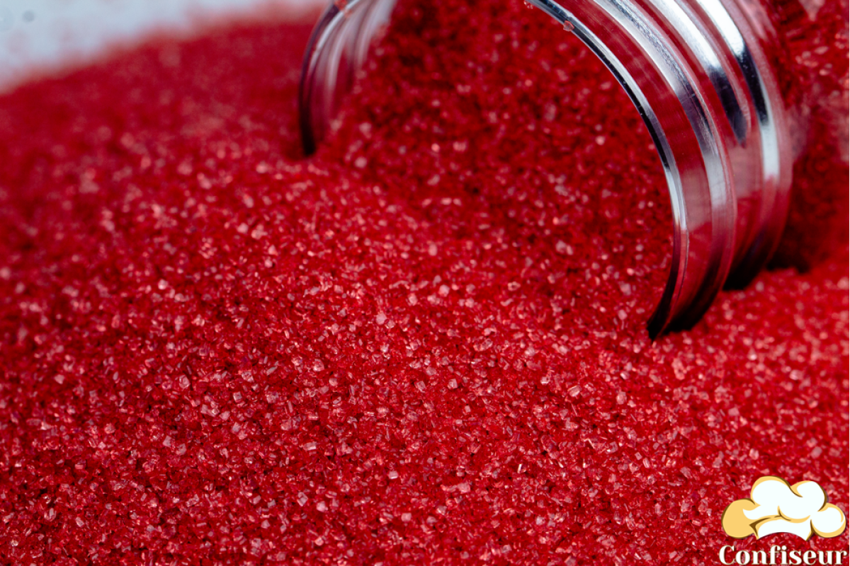 цукор кольоровий, пофарбований малиновим харчовим барвником і покритий спеціальним харчовим блиском, завдяки чому він має гарний блиск, не розтікається на виробі, підходить для декору будь-яких кондитерських виробів та коктейлів. Цукор чітко відкалібрований і має однаковий розмір піщинок