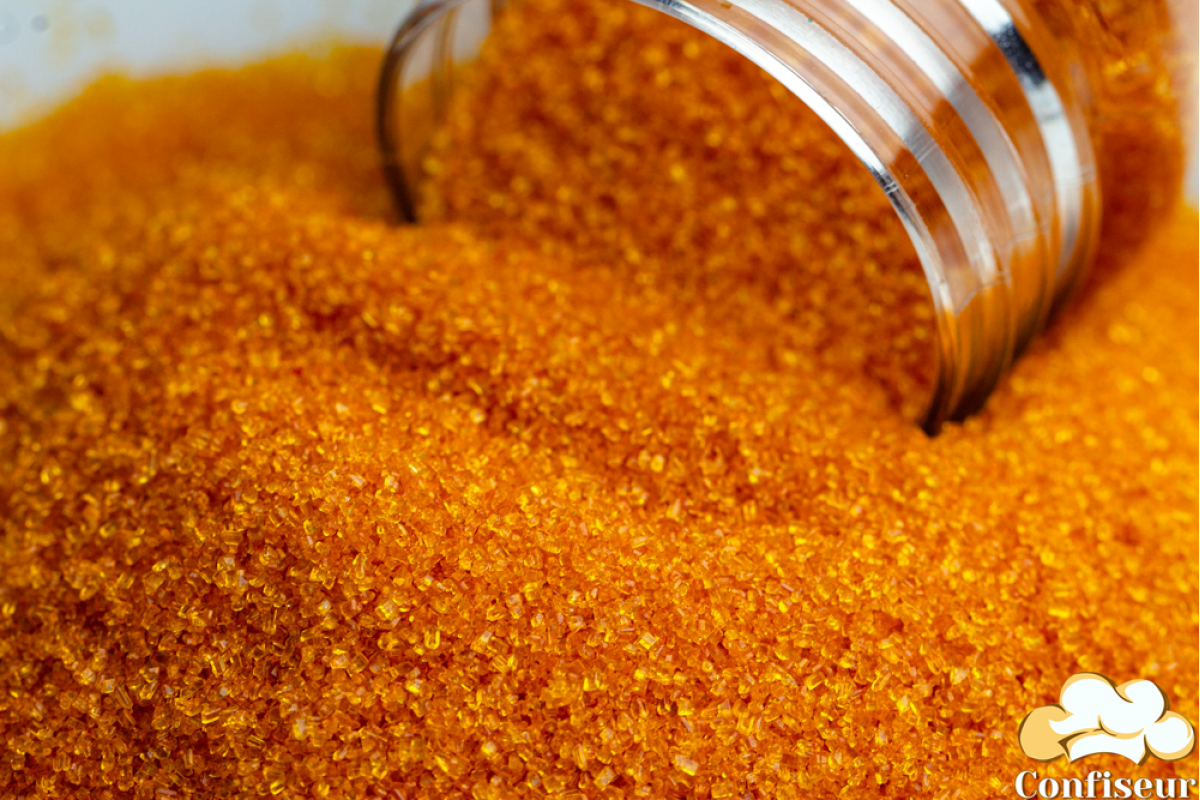 Цукор кольоровий, пофарбований золотим харчовим барвником і покритий спеціальним харчовим блиском, завдяки чому він має гарний блиск, не розтікається на виробі, підходить для декору будь-яких кондитерських виробів та коктейлів. Цукор чітко відкалібрований і має однаковий розмір піщинок.