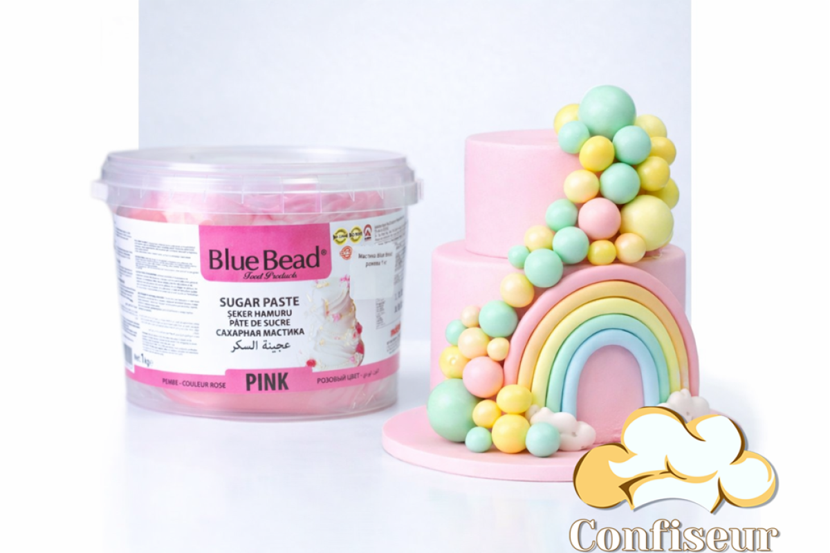 Мастика Blue Bead Рожева 1 кг застосовується для обтягування тортів та ін. кондитерських виробів, а також для виготовлення фігурок та елементів декору.