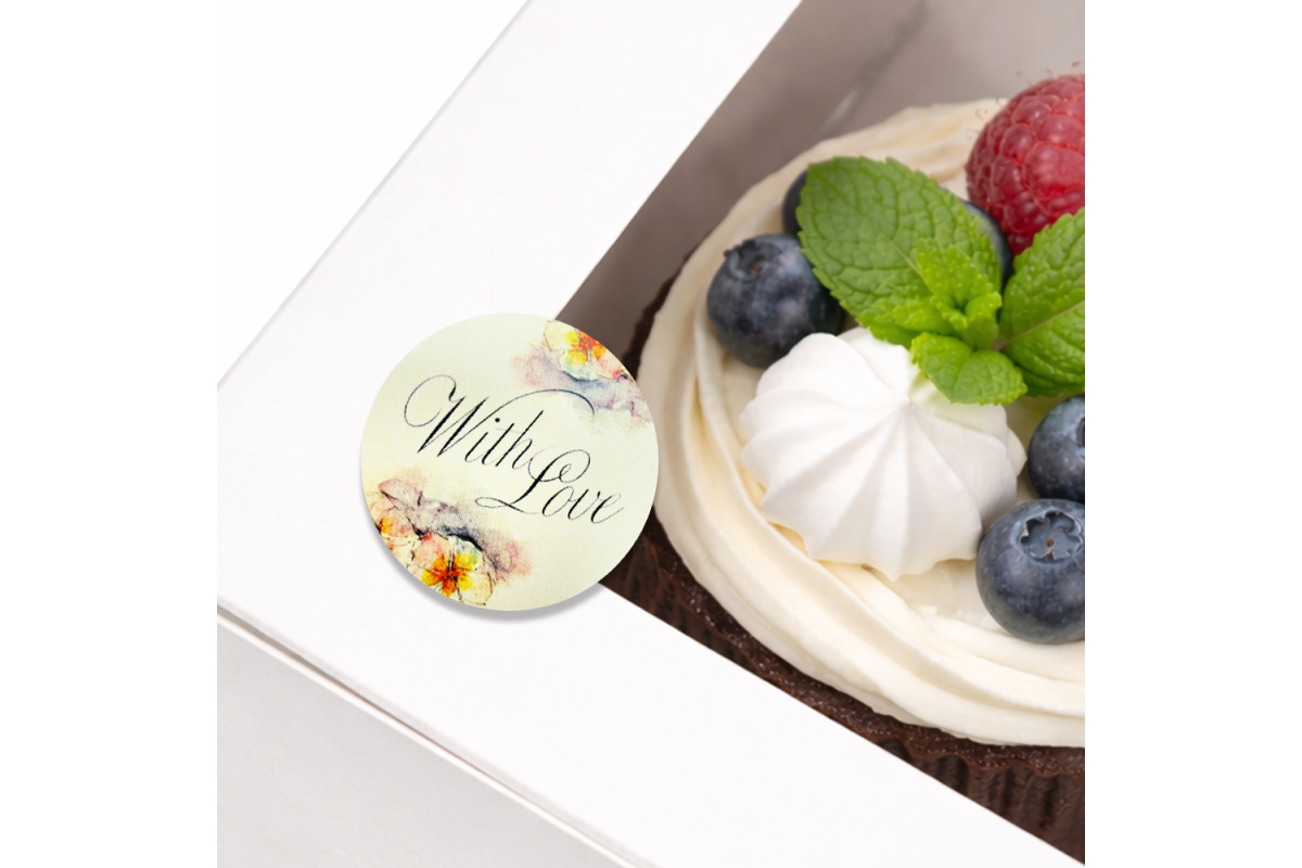 Прикрасьте коробочку з капкейками, пакетик з пряниками або бокс з макаронсами такий наклеечкой і Ваш твір буде виглядати ще більш виграшно і респектабельно.