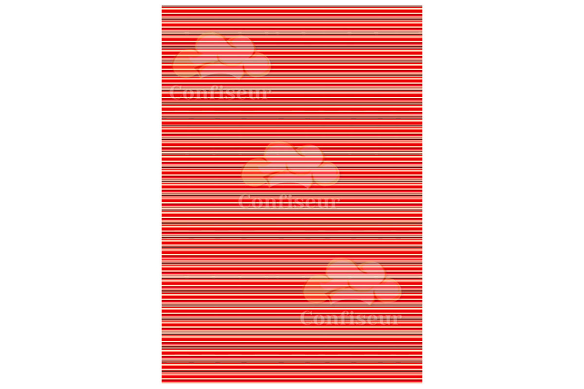 Плівка перекладна червоні Смуги для створення шоколадного декору, шоколадну глазур розтопити до t 32 або взяти заздалегідь темперований шоколад, нанести кондитерським шпателем на плівку, тонким шаром, дати застигнути 30-60хв, потім помістити в холодильник на 15-30хв. Дістати з хол. зняти плівку, малюнок перенесеться на шоколад. Працювати з шоколадом слід в приміщенні з t +18 +22 гр. Зберігати плівку в сухому і темному місці, від попадання прямих сонячних променів.