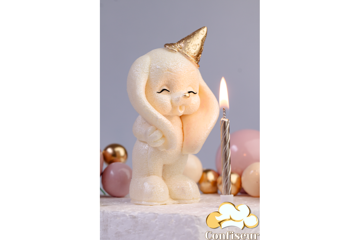 Шоколадна статуетка біла з золотом "Зайка задуває свічку" зі свічкою