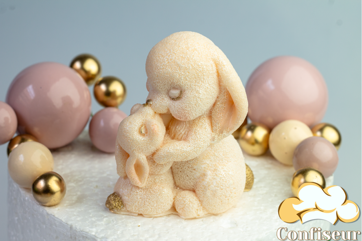 Шоколадна статуетка персикова "Зайчиха с зайченям" з золотом
