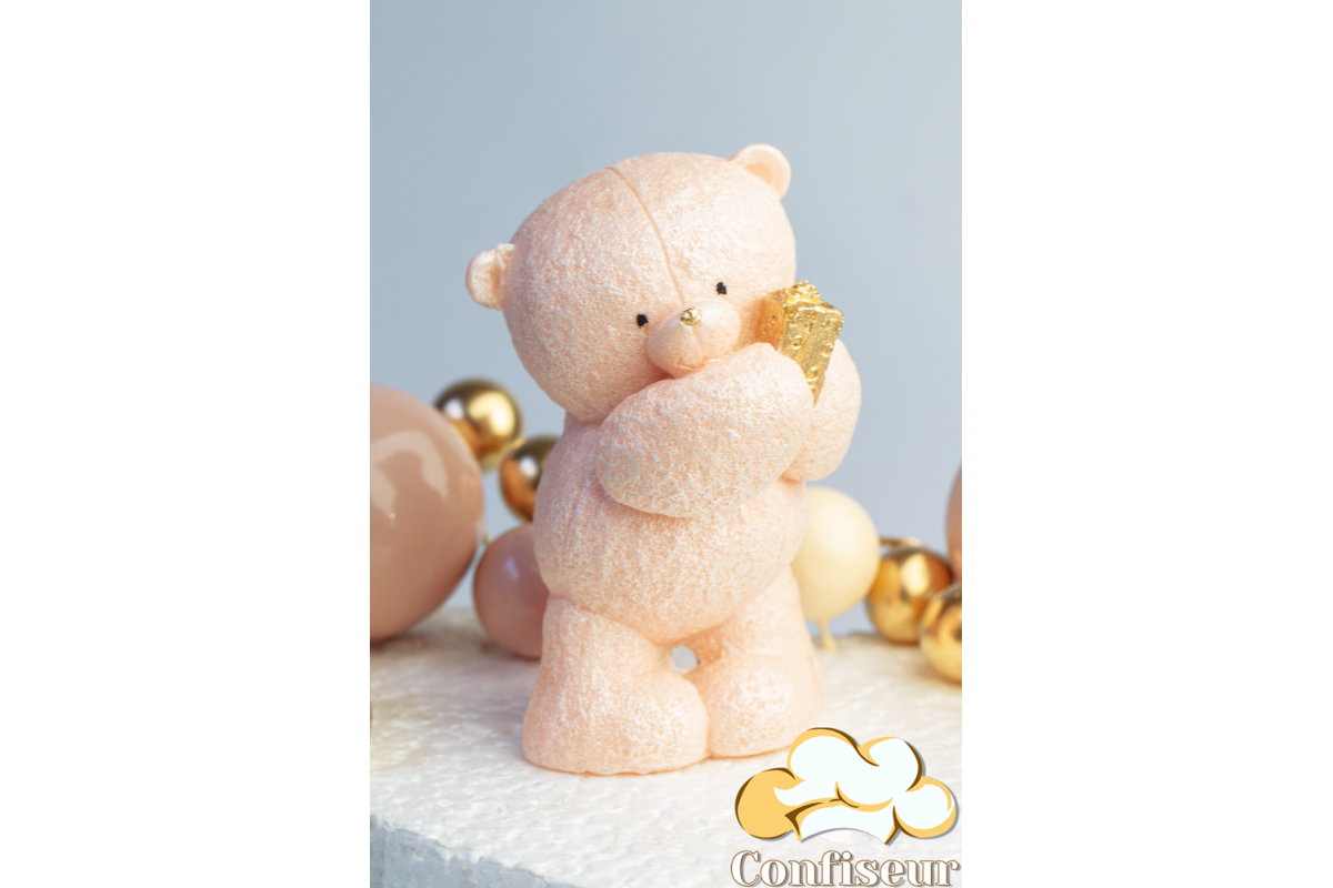 Шоколадна статуетка "Персиковий ведмедик з золотим подарунком"