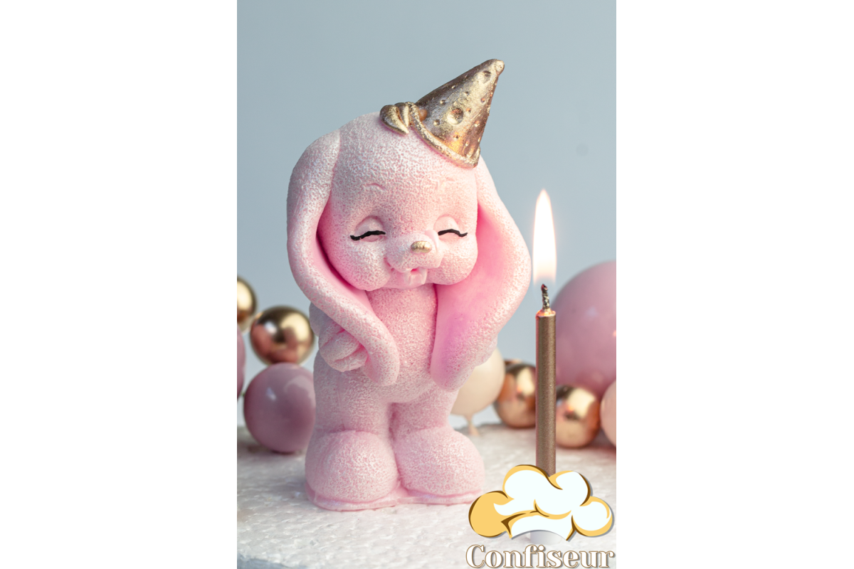 Шоколадна статуетка рожева "Зайка задуває свічку" зі свічкою