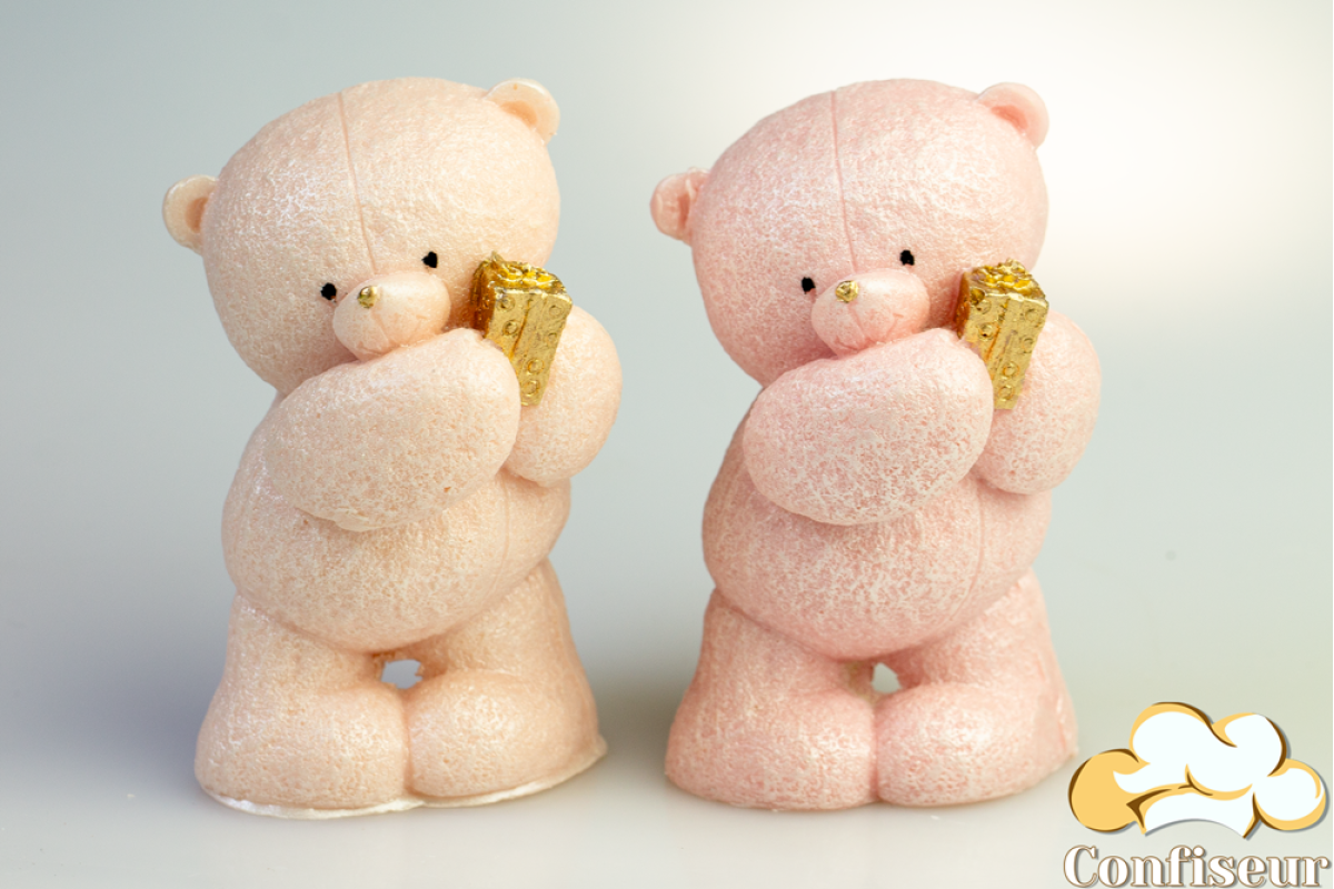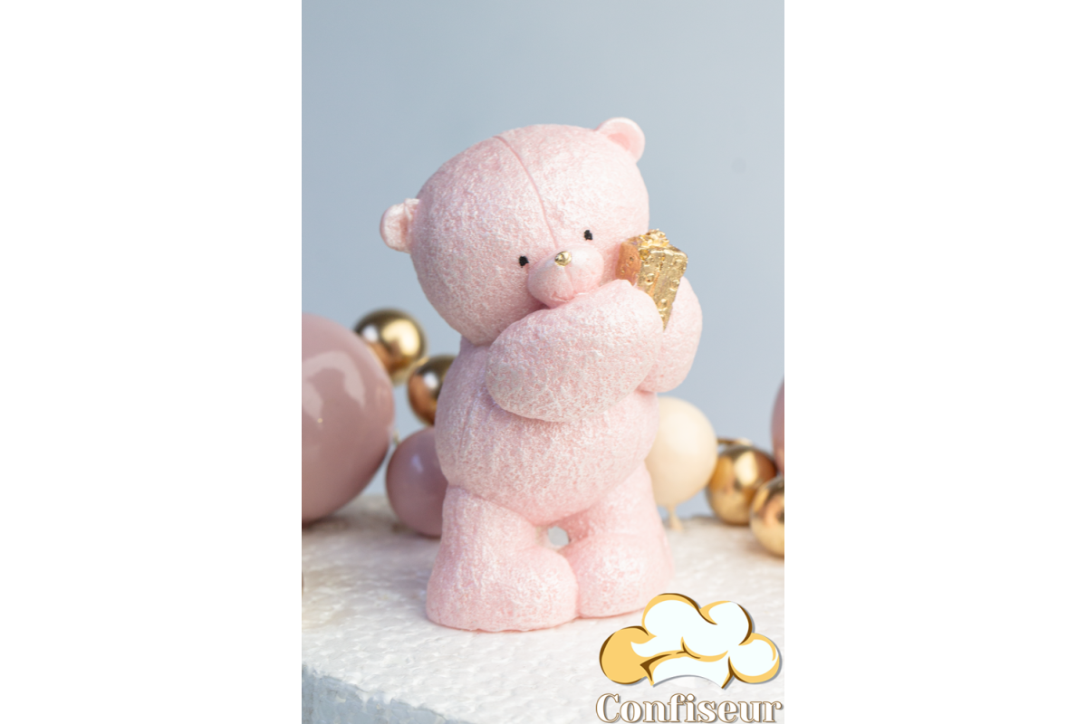 Шоколадна статуетка "Рожевий ведмедик з золотим подарунком"
