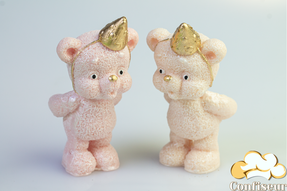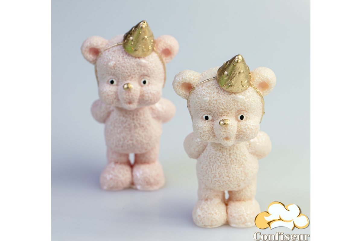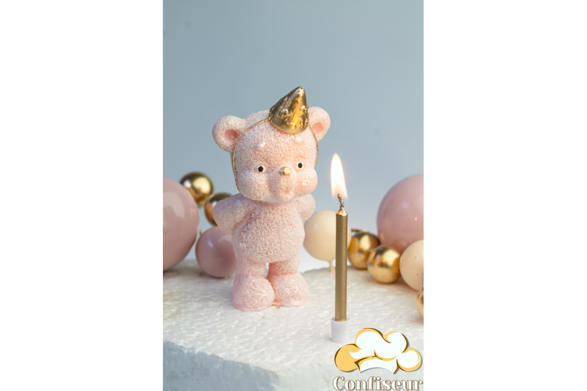 Шоколадна статуетка "Ведмедик рожевий золотий ковпак задуває свічку" зі свічкою