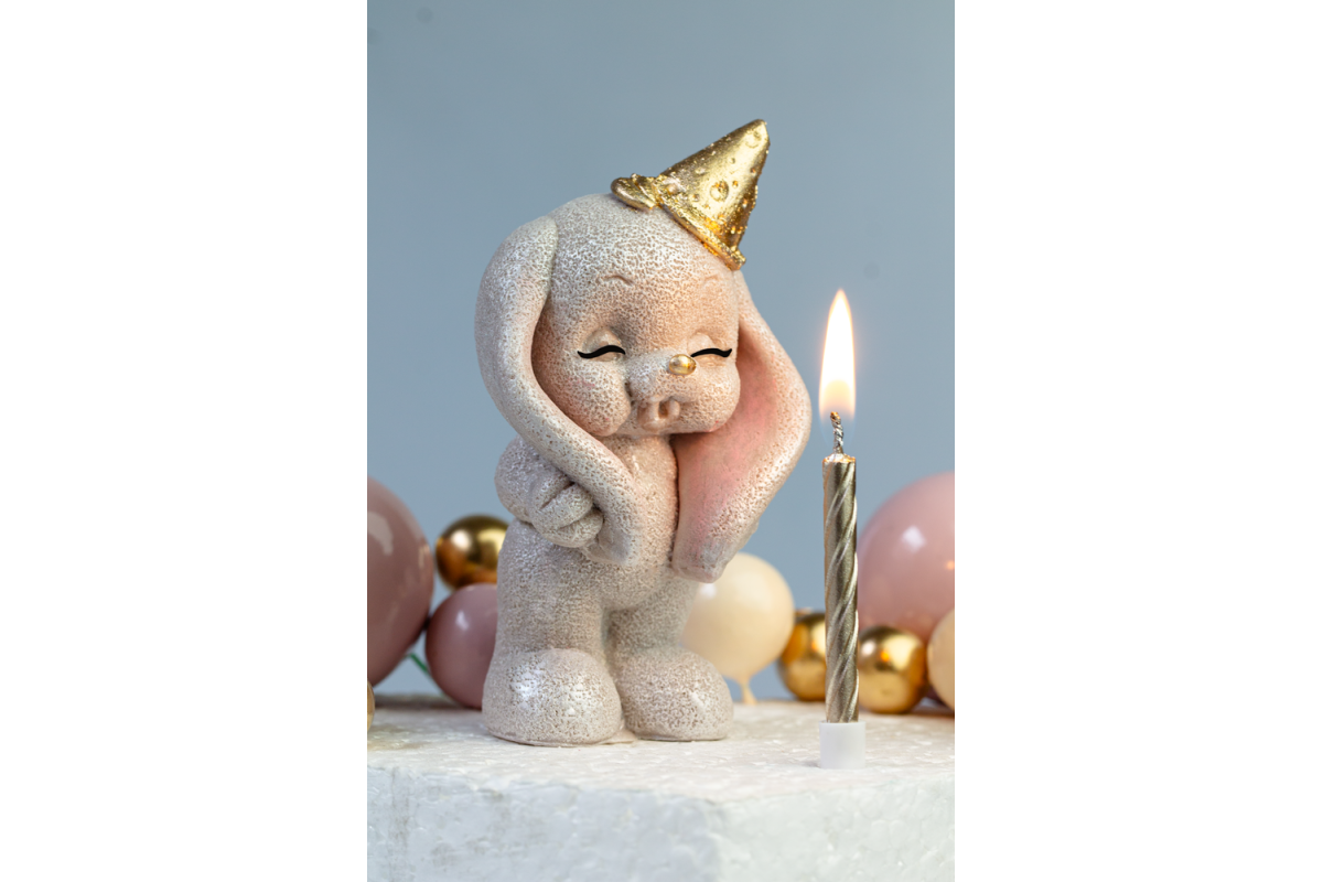 Шоколадна статуетка тоффі з золотом "Зайка задуває свічку" зі свічкою